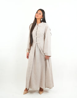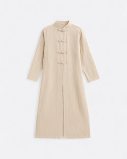 Laisse-toi séduire par cet ensemble effet lin raffiné composé d’une robe sans manches fluide et d’un kimono long à boutonnière inspiré des tenues traditionnelles chinoises. Avec sa ceinture intégrée sur les côtés, il sculpte subtilement la silhouette tout en préservant une allure ample et gracieuse.